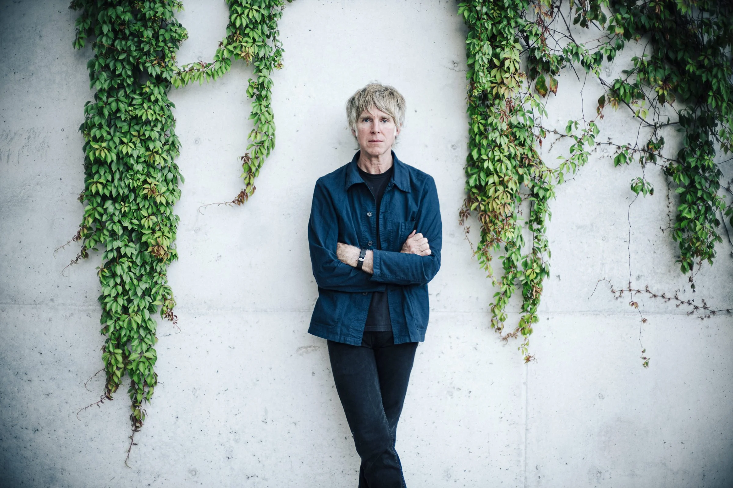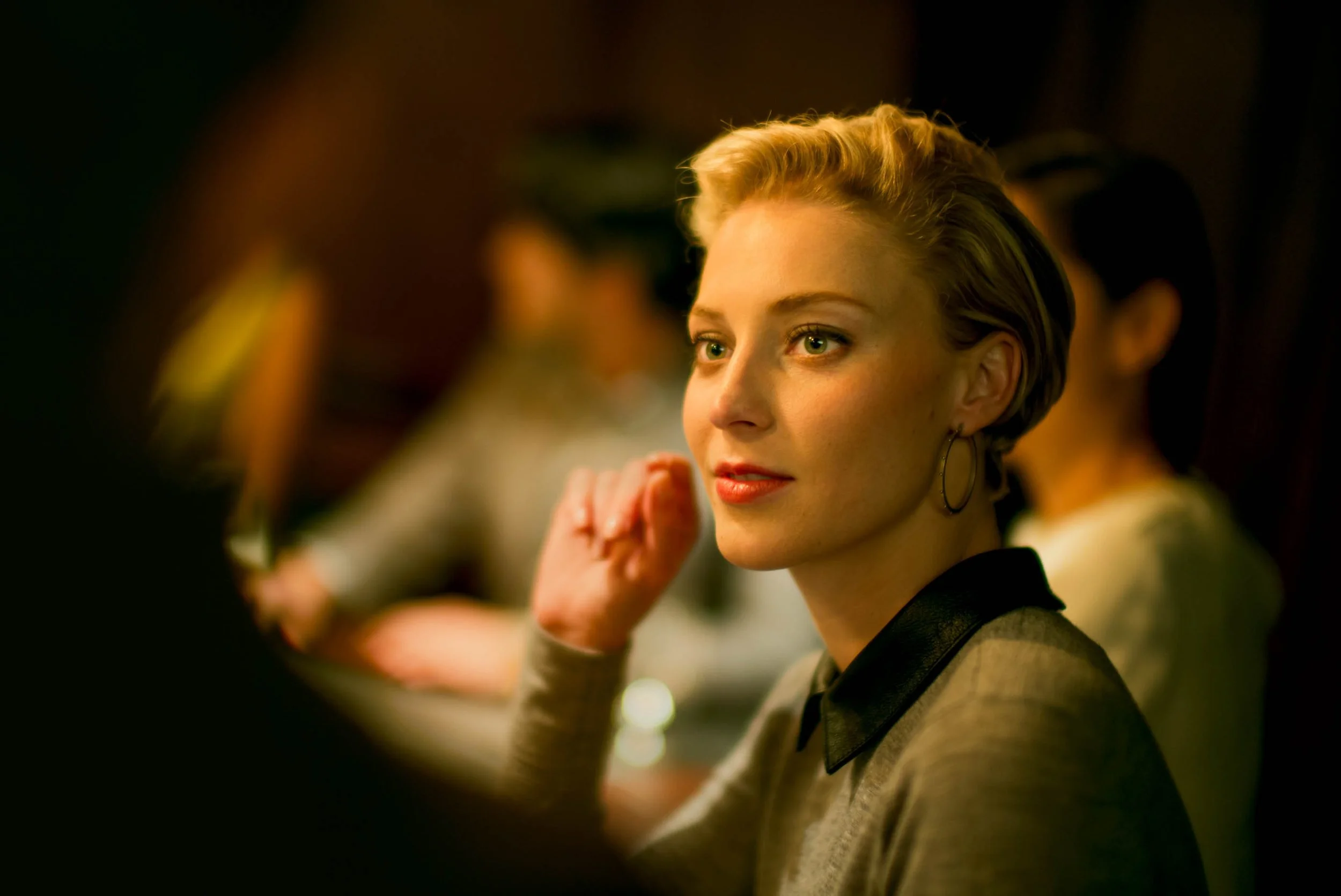 Woman with short blonde hair looking thoughtfully to the side, wearing a gray top with a black collar, in a dimly lit setting.