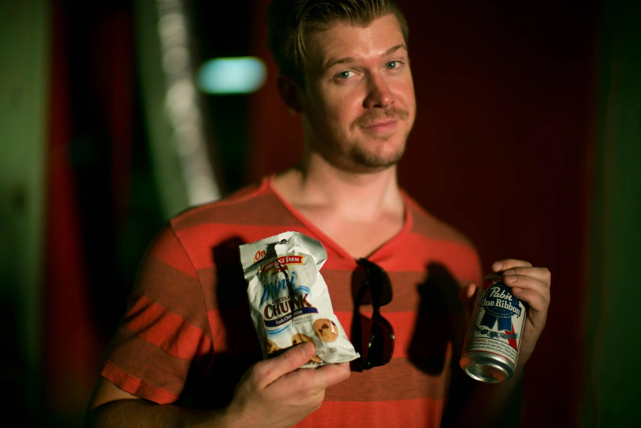 Man in red striped shirt holding mini chocolate chip cookies and Pabst Blue Ribbon beer