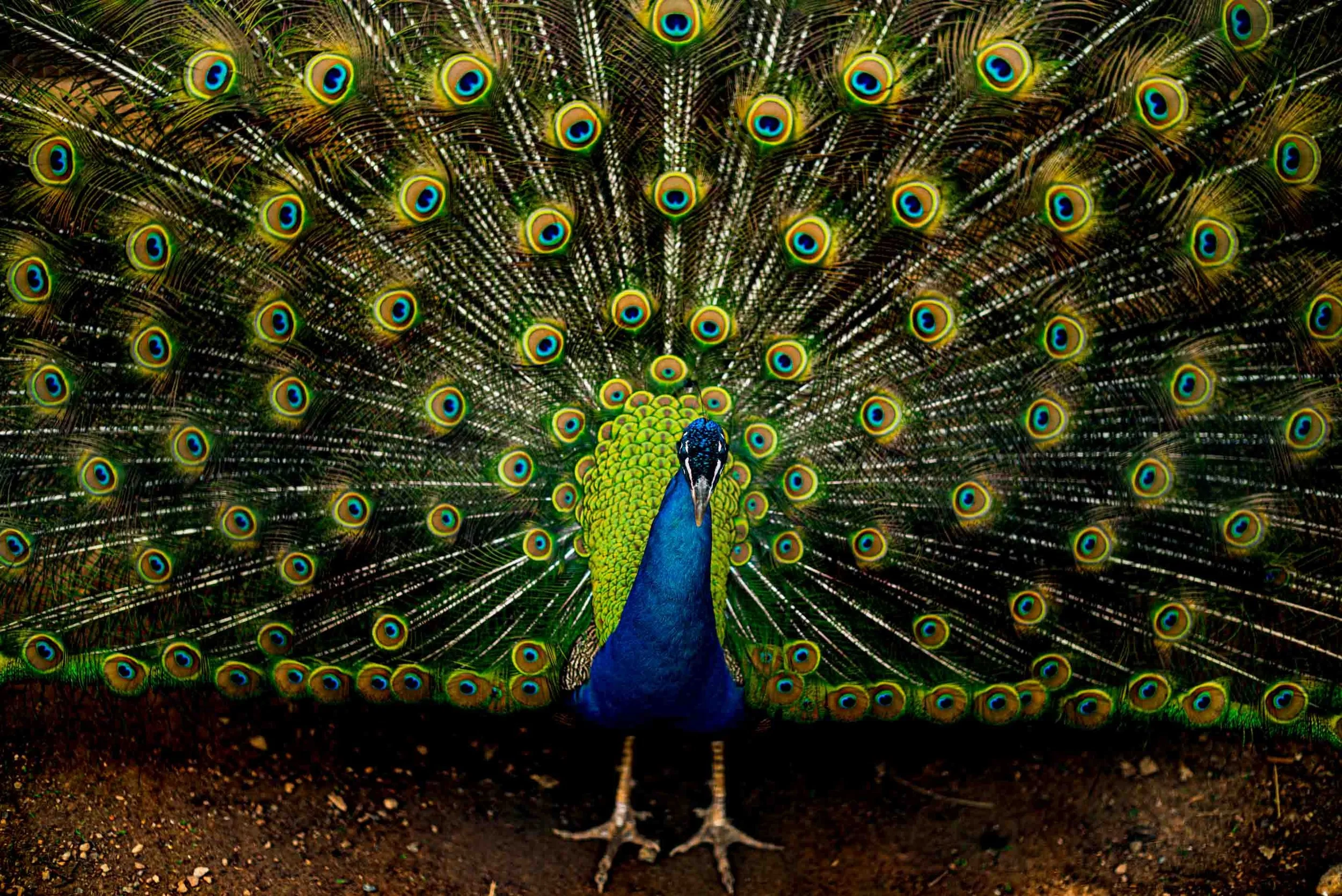 Smiling bald man in a floral shirt with a blue blazer and straps, outdoor background.