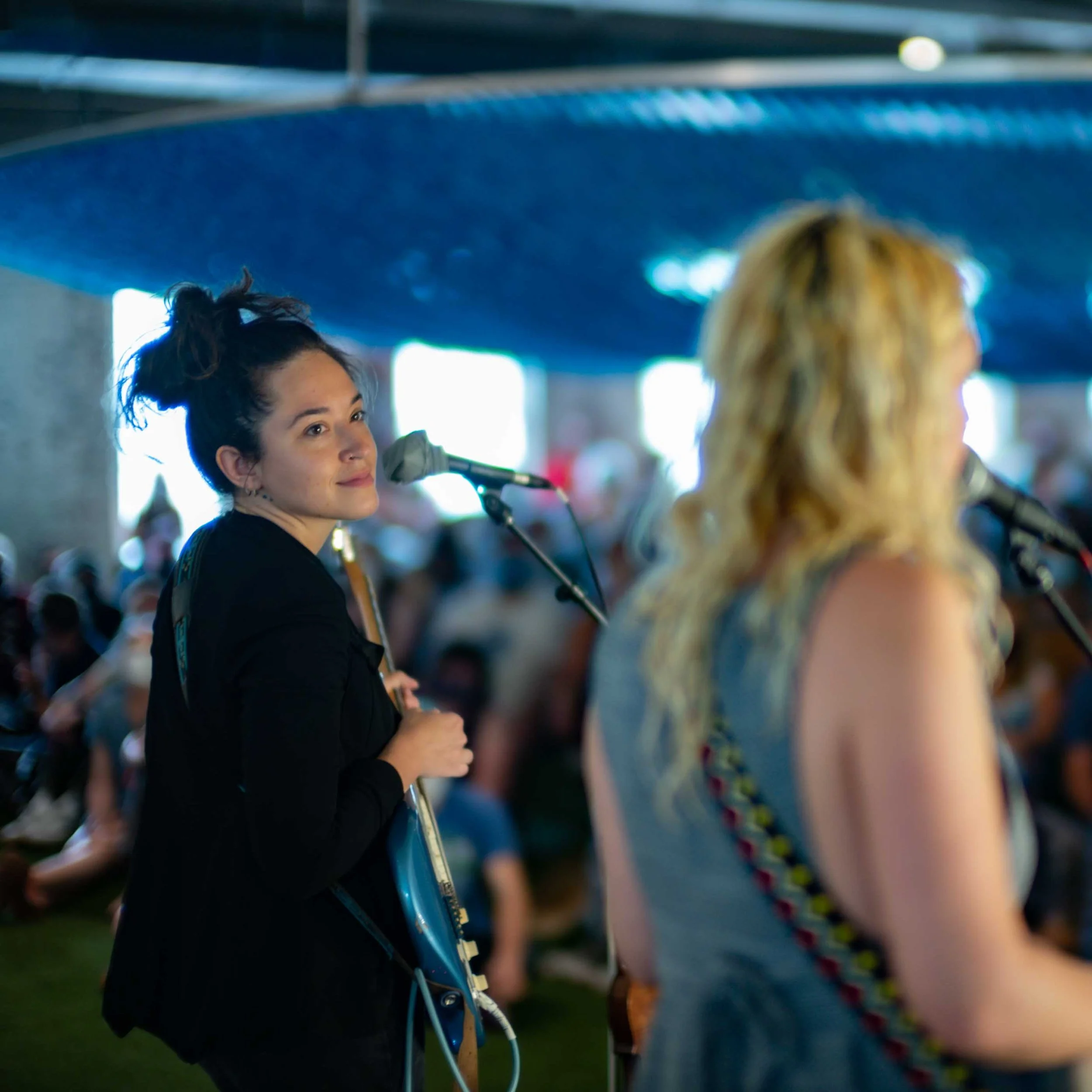 Two musicians performing live indoors, one with a guitar and microphone, surrounded by a crowd.