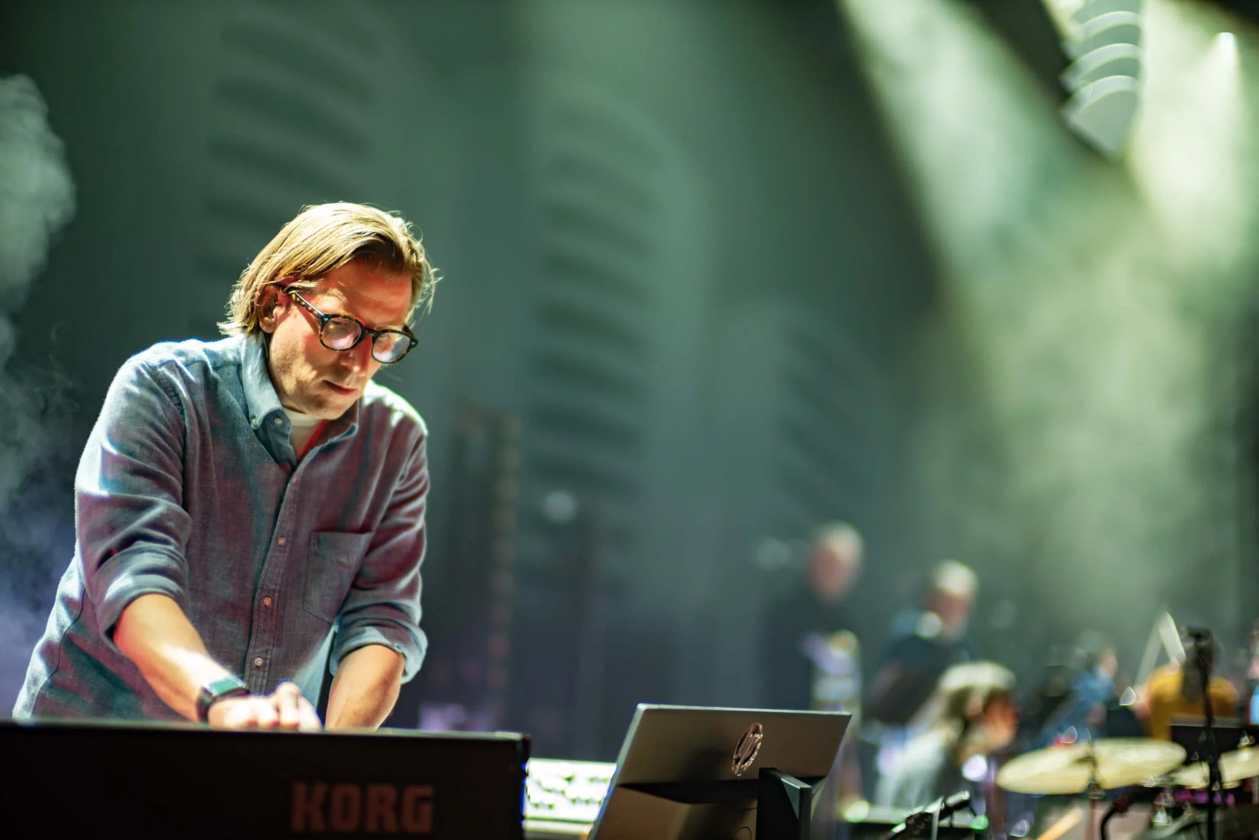 Musician playing a keyboard on stage with dim lighting and a blurred background, including drums and other musicians.