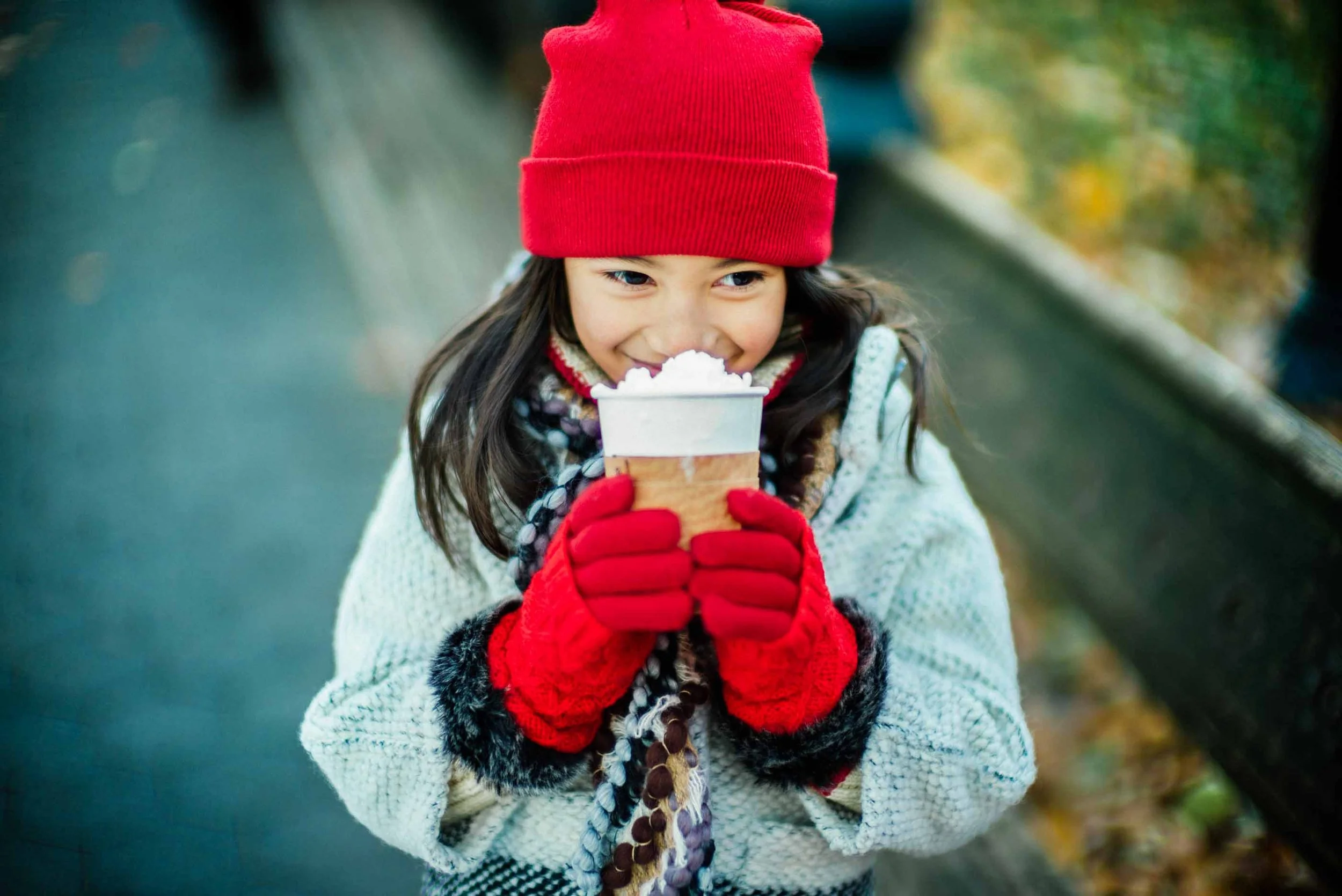 Child in red hat and gloves holds a cup with whipped cream outdoors on a cold day.