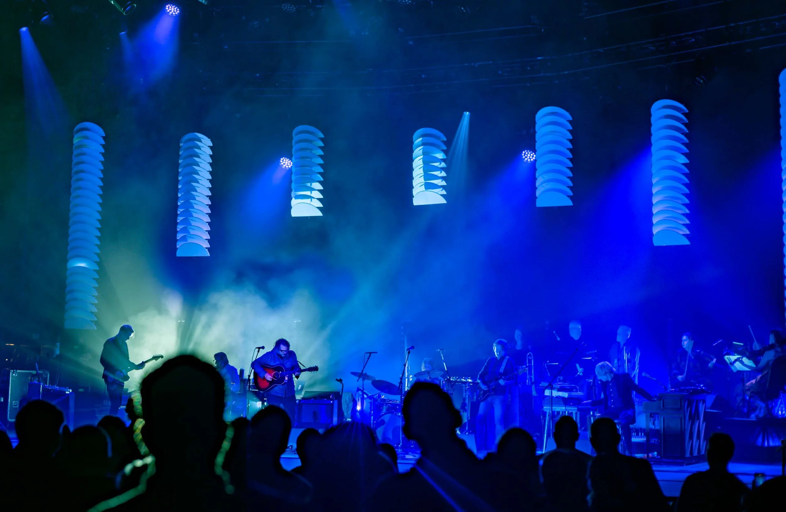 Concert stage with blue lighting, band performing live, audience silhouette, decorative ceiling elements.