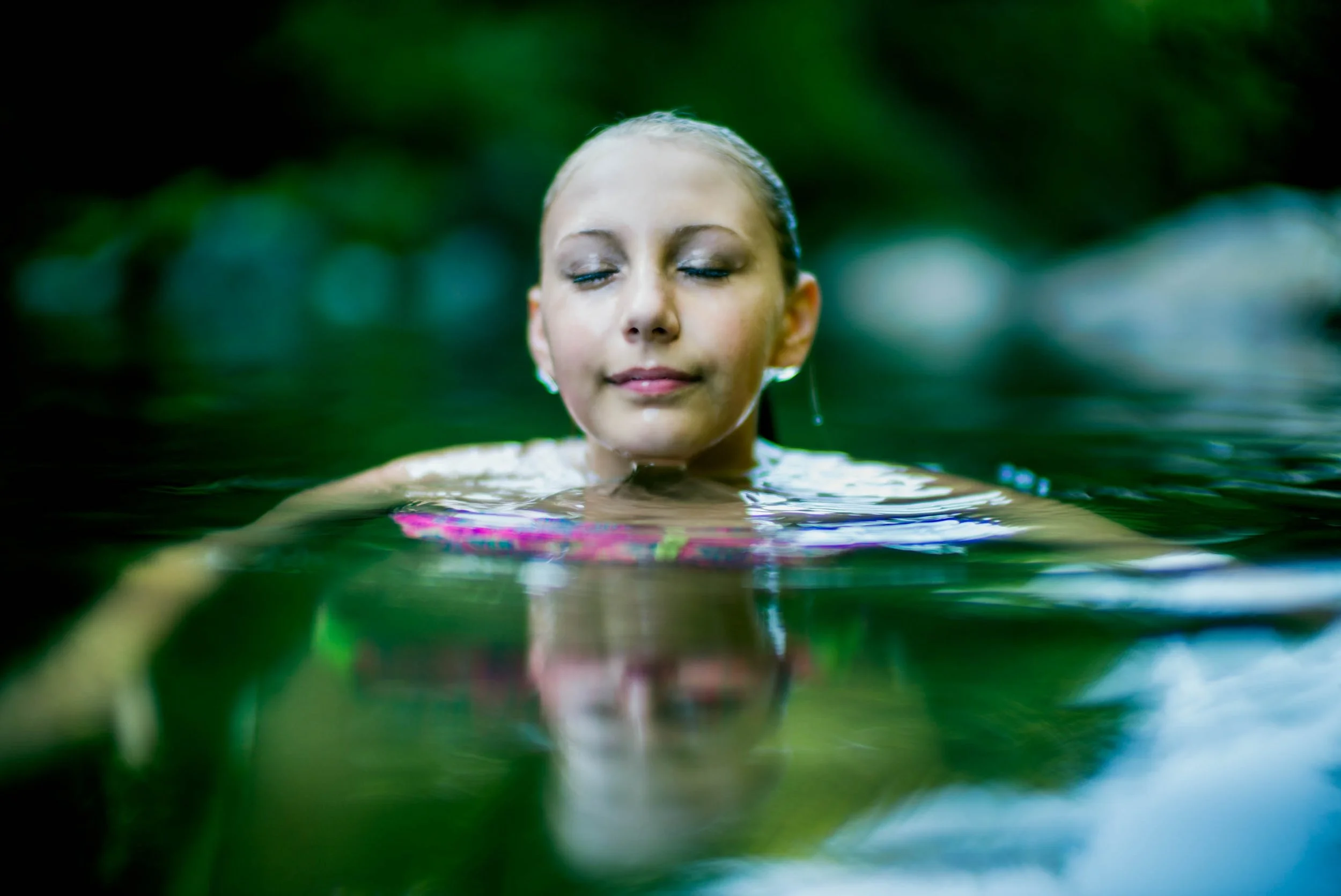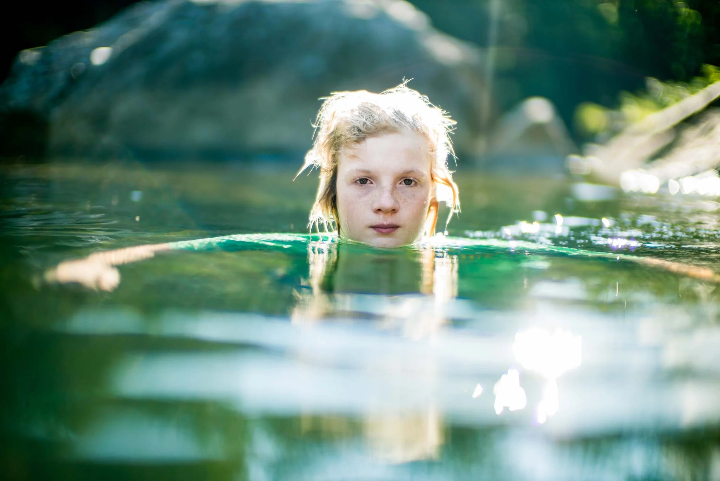 Person with blonde hair partially submerged in clear water, natural light creating reflections.
