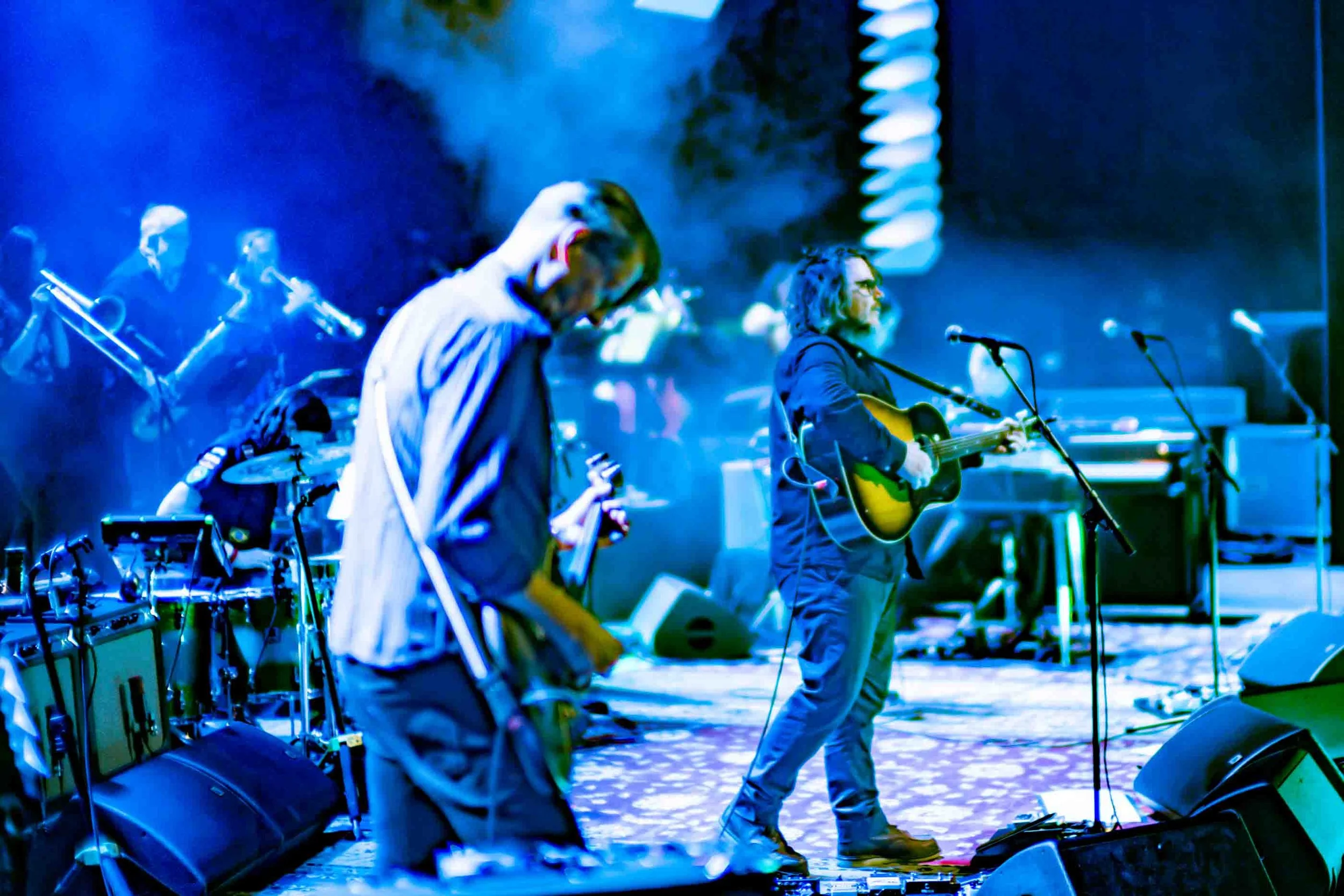 A live music concert with musicians playing instruments on stage, including guitars and brass instruments, under blue lighting.