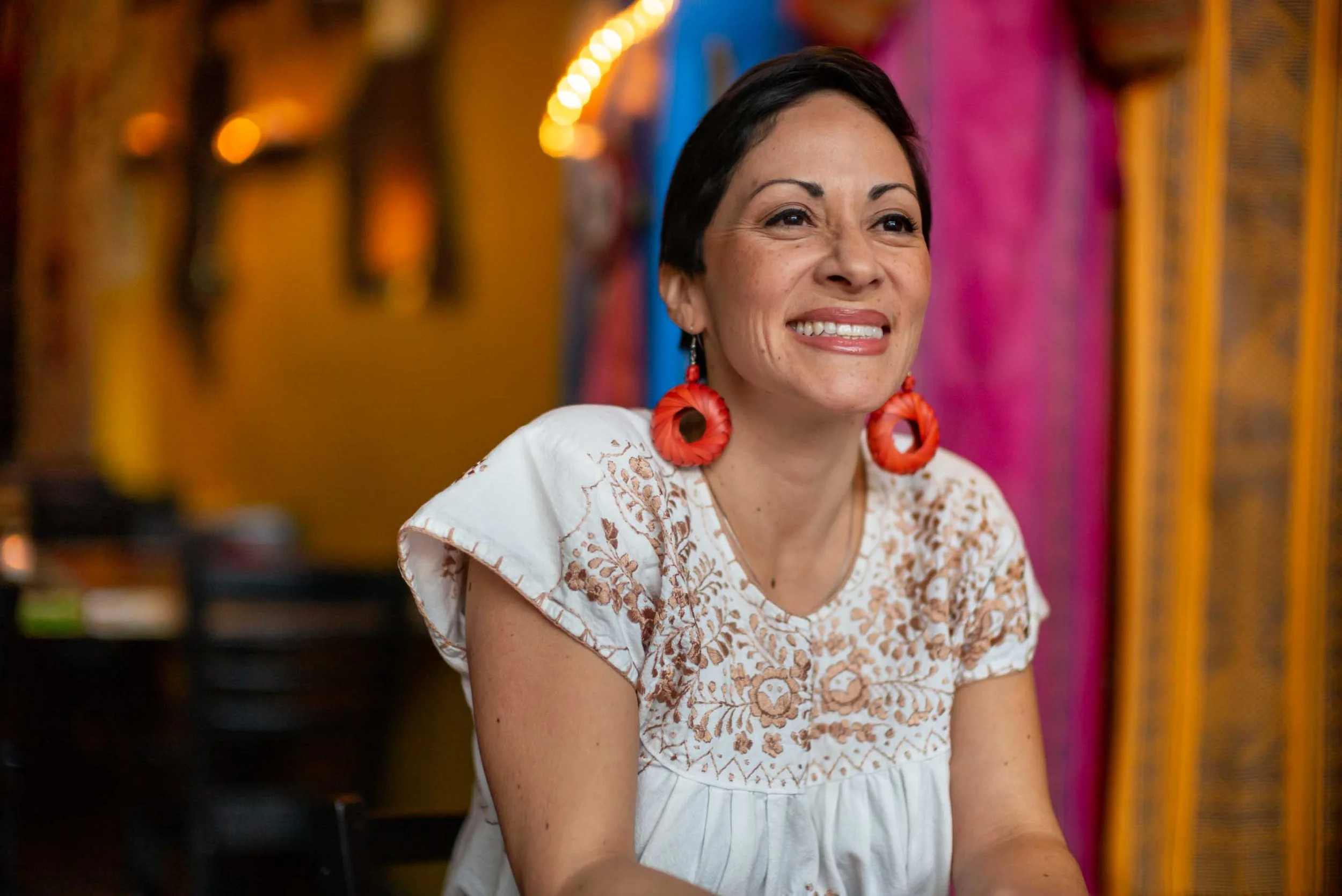 Smiling woman wearing orange earrings and a white embroidered top, seated indoors with colorful background.