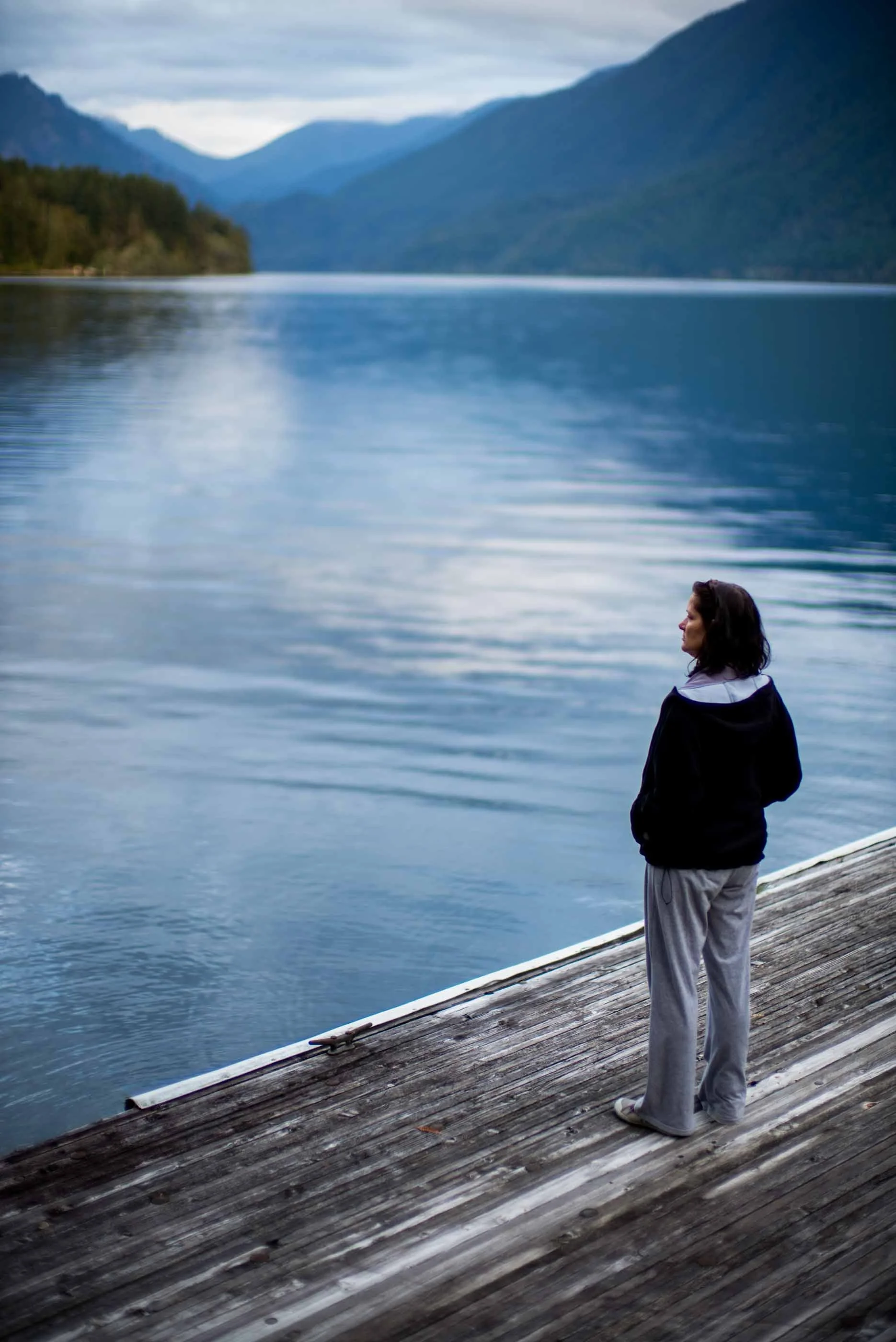 Person standing on a wooden dock overlooking a calm lake with mountain backdrop