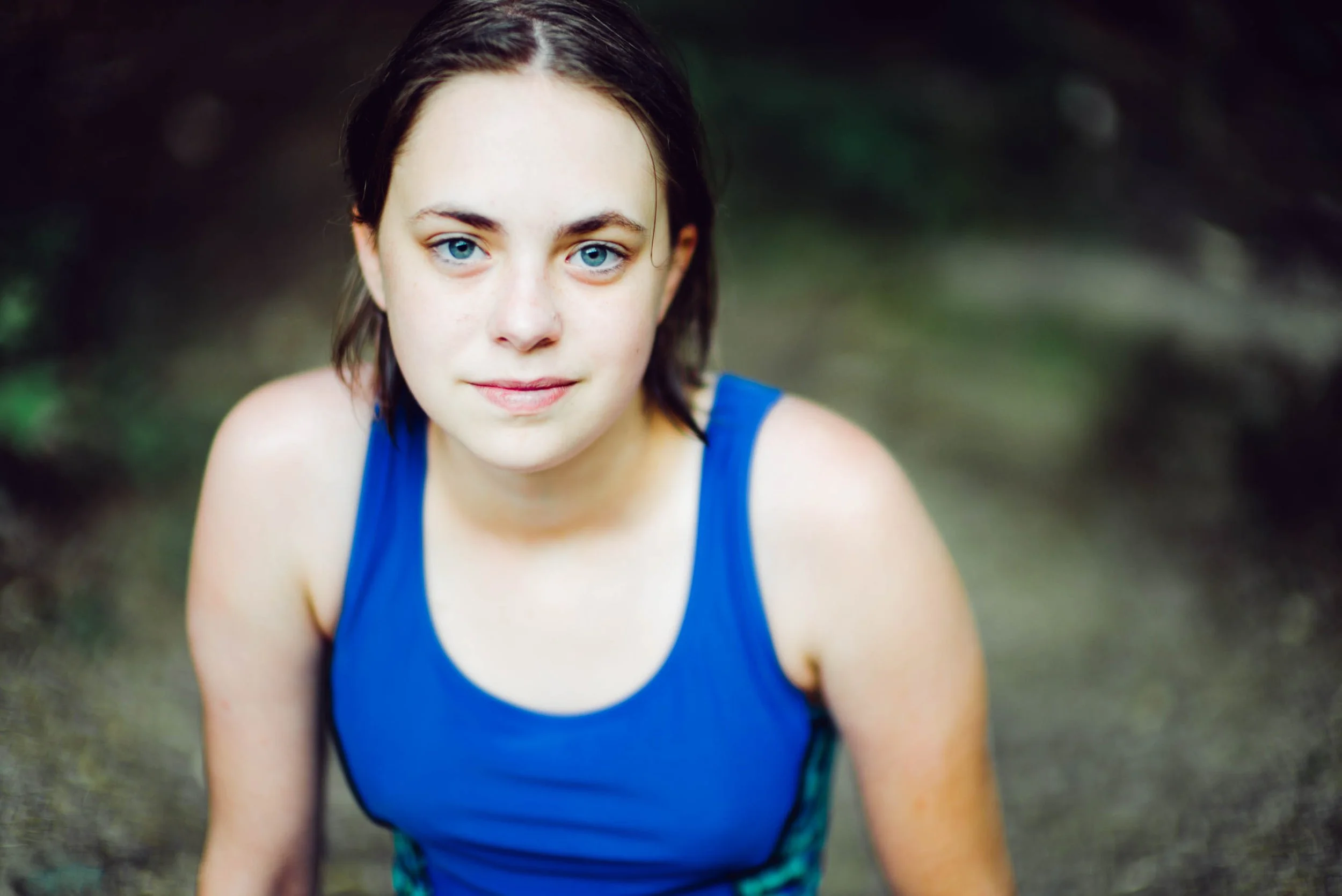 Woman with brown hair and blue eyes wearing a blue tank top outdoors